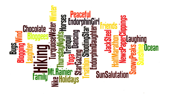 In today’s blog EndorphinGirl™ shares some of the things that get her endorphed. Yes, you may have read about some of these things in past blogs. BUT these endorphin-enhancing elements are shared in a word-cloud blog instead of in her ‘traditional’ blog post. While this may be a first as far as blogging, perhaps a word-cloud blogging trend is about to take off; it probably won’t be her last word-cloud blog. No matter, no matter, she hopes you enjoy the word-cloud blogging concept and consider trying your own endorphin-enhancing or any other type of word cloud. Here is a link to get you started http://www.wordle.net/create. Thanks to Suz for introducing EndorphinGirl™ to the word-cloud world.